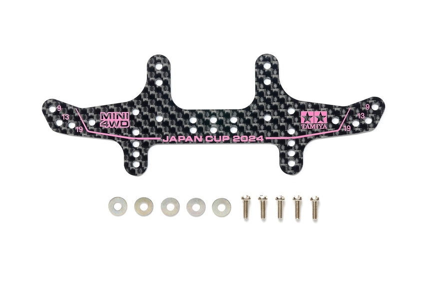 This limited-edition carbon fiber rear multi roller setting stay (1.5mm) commemorates Japan Cup 2024. The item is the same shape as Item 95145; however, this item includes the Japan Cup and Tamiya logos in pink print.